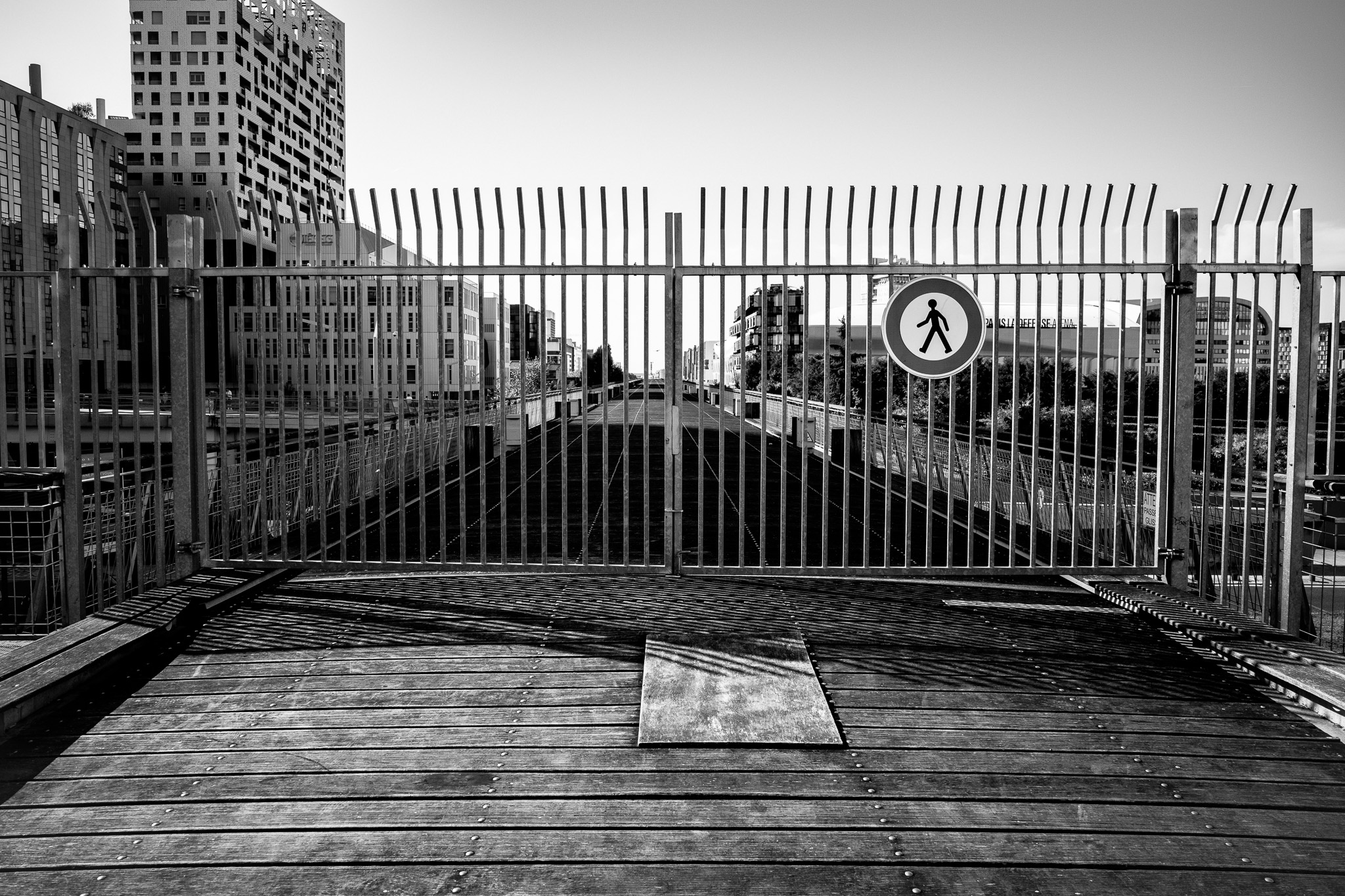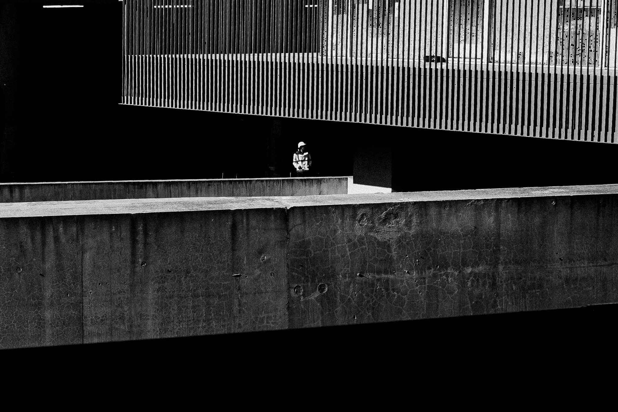 Je photographie la position de l'individu dans les structures de la ville et sa disparition progressive dans ces structures. Les figures humaines sont minuscules, l'architecture est dominante, les espaces sont géométriques, parfois fermés, souvent illisibles. Les individus ne contrôlent pas l'espace, ils sont portés par lui, canalisés, absorbés. La ville ne les a pas prévus — elle les a rendus superflus.